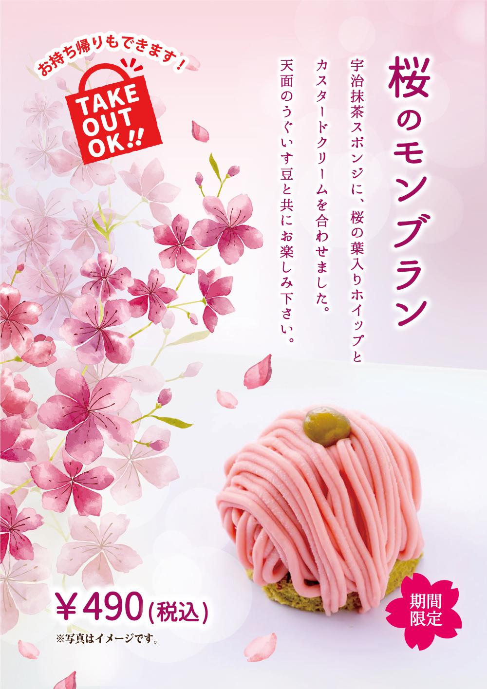 2月15日(水)開始 期間限定『桜のモンブラン』 2023年2月15日 季節限定おすすめケーキ 2023年2月15日 開始 桜のモンブラン 春の定番ケーキ!宇治抹茶スポンジに、桜の葉入りホイップとカスタードクリームを合わせました。天面のうぐいす豆と共にお楽しみ下さい。 喫茶室ルノアール インフォメーション 季節のおすすめ メニュー 店舗限定メニュー 当店のこだわり カロリー・アレルギー物質情報 店舗検索 採用情報