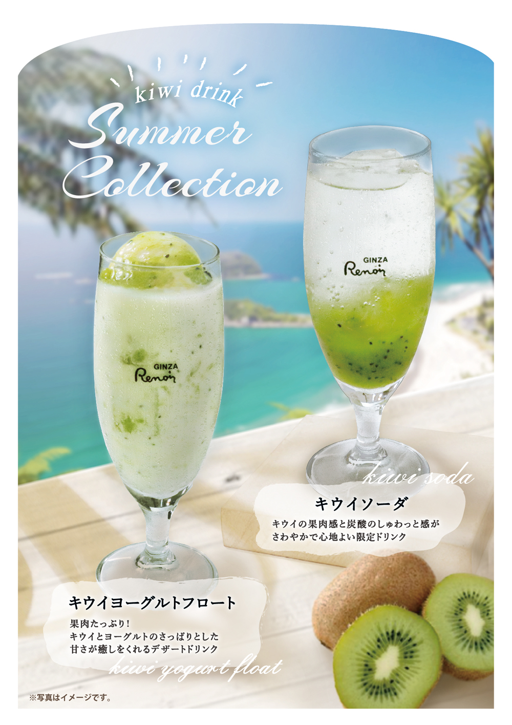 7月15日(月)開始 季節限定おすすめドリンク 2024年7月15日 季節限定おすすめドリンク 2024年7月15日(月) 開始 キウイヨーグルトフロート 果肉たっぷり! キウイとヨーグルトのさっぱりとした甘さが夏の疲れを癒しをくれるデザートドリンク。 キウイソーダ キウイの果肉感と炭酸のしゅわっと感が爽やかで心地よい、この夏限定のドリンクです。 喫茶室ルノアール インフォメーション 季節のおすすめ メニュー 店舗限定メニュー 当店のこだわり カロリー・アレルギー物質情報 店舗検索 採用情報