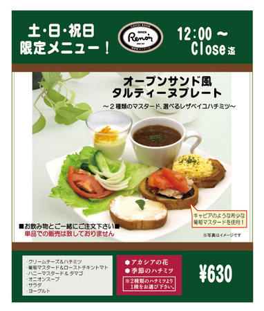 喫茶室ルノアール7店舗におきまして、平成24年11月3日土曜日より下記の土日祝日限定プレートメニューが導入となります。