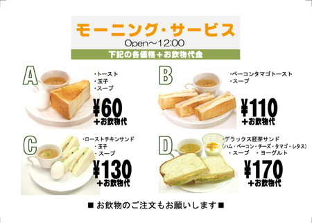 モーニングサービスメニュー変更のご案内 2011年10月17日 喫茶室ルノアール 各店舗におきまして、平成23年10月1日水曜日よりモーニングサービスメニューが変更となります。 一部店舗におきましては、メニュー内容が異なる店舗もございます。何卒ご了承下さい。 各店舗のご案内はこちらから