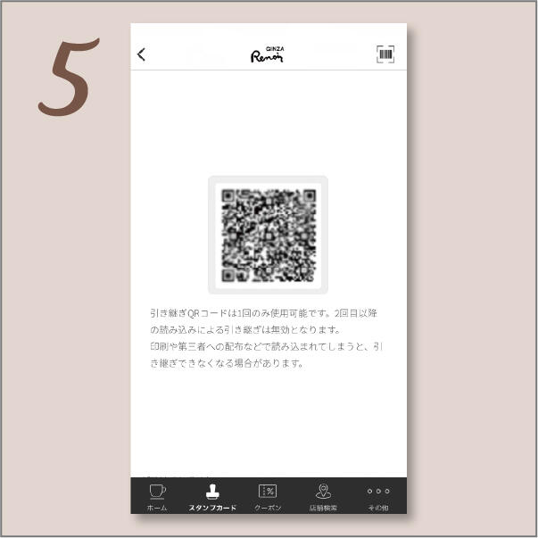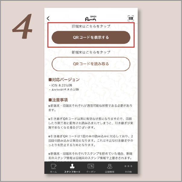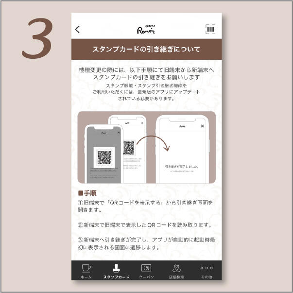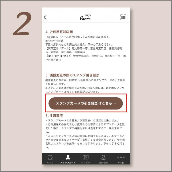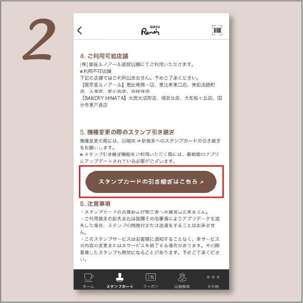②「スタンプカードの引き継ぎはこちら」をタップ