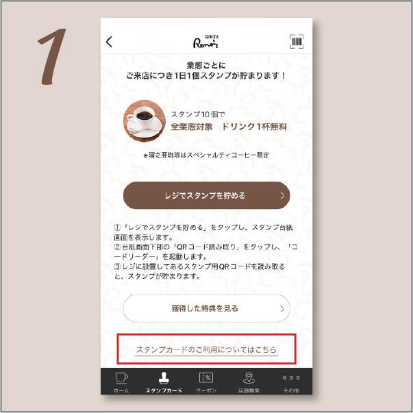 ①スタンプカードページ下部の 「スタンプカードのご利用についてはこちら」を タップ